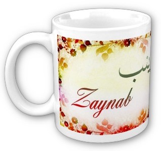 Mug avec le prénom Zaynab calligraphié en arabe (زينب) ainsi que son épellation lettre par lettre en arabe.