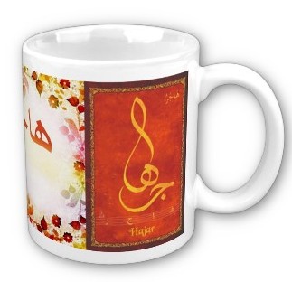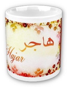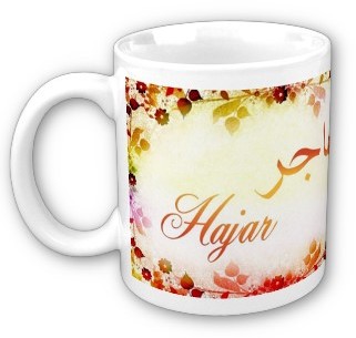 Mug avec le prénom Hajar calligraphié en arabe (هاجر) ainsi que son épellation lettre par lettre en arabe.