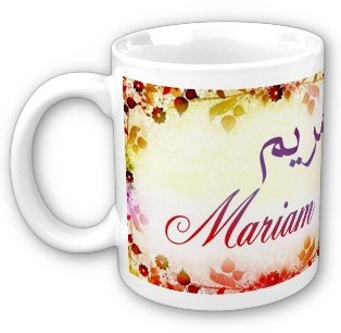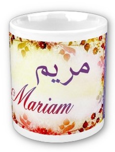 Mug avec le prénom Mariam calligraphié en arabe (مريم) ainsi que son épellation lettre par lettre en arabe.