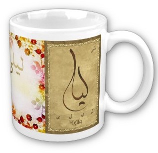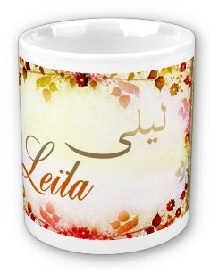 Mug avec le prénom Leïla calligraphié en arabe (ليلى) ainsi que son épellation lettre par lettre en arabe.