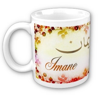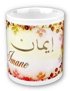 Mug avec le prénom Imane calligraphié en arabe (إيمان) ainsi que son épellation lettre par lettre en arabe.