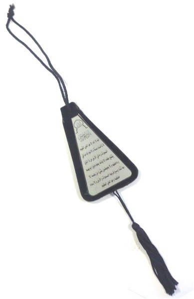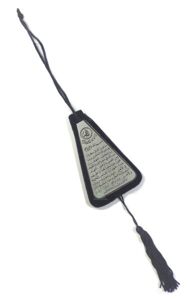 Pendentif en velours et plaque argentée Invocation du voyageur (Dou'a Assfar) sur une face et le Verset du trône (Ayat Al Koursi) sur l'autre face.