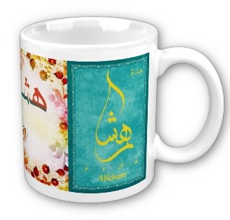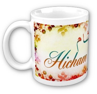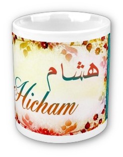 Mug avec le prénom masculin Hicham calligraphié en arabe (هشام) ainsi que son épellation lettre par lettre en arabe.
