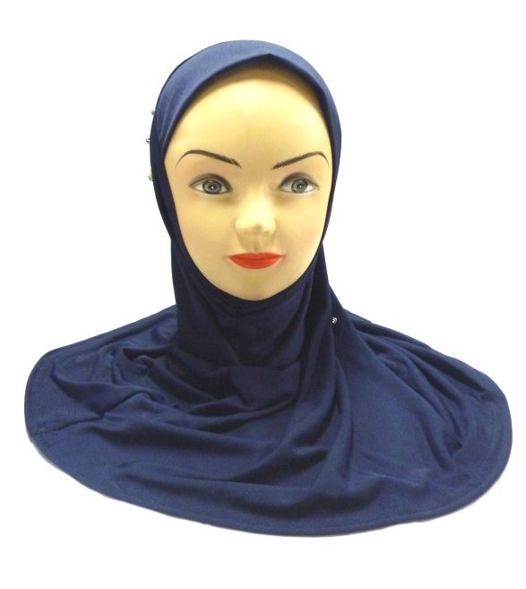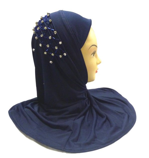 Beau Hijab 1 pièce de couleur bleue nuit, orné de perles tout au long d'une bande en forme de filet, en arrière de la tête...