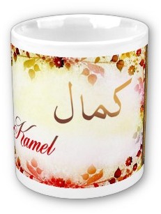 Mug avec le prénom "Kamel" calligraphié en arabe (كمال) ainsi que son épellation lettre par lettre en arabe.