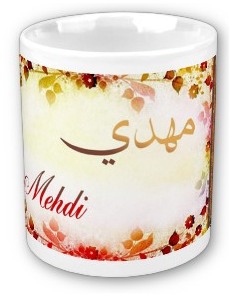 Mug avec le prénom "Mehdi" calligraphié en arabe (مهدي) ainsi que son épellation lettre par lettre en arabe.