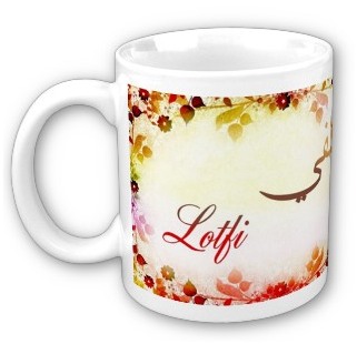 Mug avec le prénom "Lotfi" calligraphié en arabe (لطفي) ainsi que son épellation lettre par lettre en arabe.
