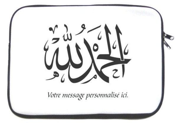 Housse pour PC portable 14 pouces avec message personnalisé et inscription calligraphique "Al-Hamdoulillâh" (Louange à Allah)", l'autre face restant blanche.