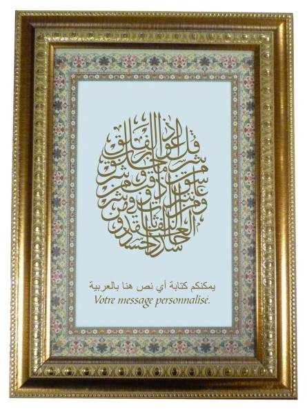 Vous recevrez un tableau avec encadrement bois décoré et doré contenant la calligraphie de Sourate Al-Falaq ainsi qu'un texte optionnel de votre choix (personnalisable) en français ou en arabe.