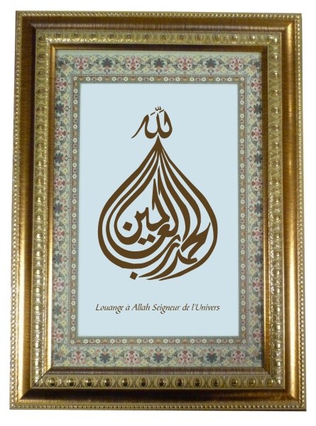 Vous recevrez un tableau avec encadrement bois décoré et doré contenant la calligraphie "Louange à Allah Seigneur de l'Univers" (Al-Hamdulilah Rabbi-l-Alamin الحمد لله رب العالامين) ainsi qu'un texte optionnel de votre choix (personnalisable) en français ou en arabe.