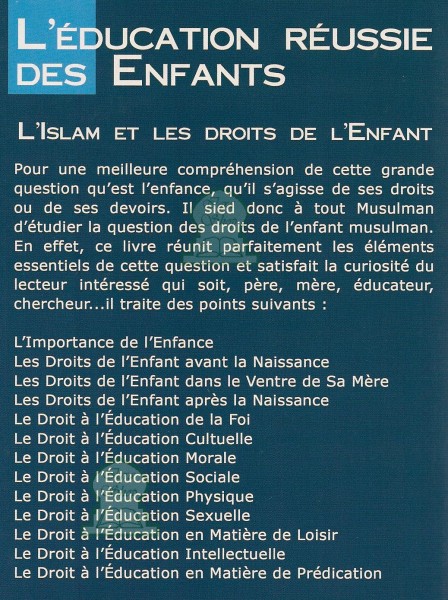 L'Islam et les droits des enfants : Ce livre a obtenu le 1er prix des universités islamiques.Pour une meilleure compréhension de cette grande question qu'est l'enfance, qu'il s'agisse de ses droits ou de ses devoirs. Il sied donc à tout Musulman d'étudier la question des droits de l'enfant musulman. En effet, ce livre réunit parfaitement les éléments essentiels de cette question et satisfait la curiosité du lecteur intéressé qui soit, père, mère, éducateur, chercheur...Il traite des points suivants :