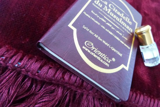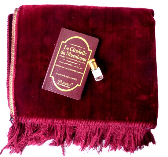 Pack Cadeau constitué d'un joli tapis original en velours (fabrication Turque) + le livre "La Citadelle du Musulman" + Parfum Musc concentré sans alcool (mixte). Peut être offert pour un homme ou une femme.