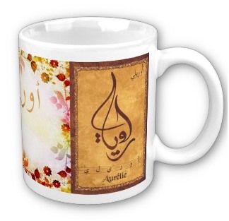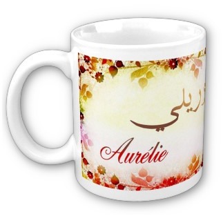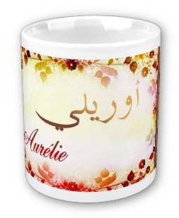 Mug avec le prénom "Aurélie" calligraphié en arabe (اوريلي) ainsi que son épellation lettre par lettre en arabe.