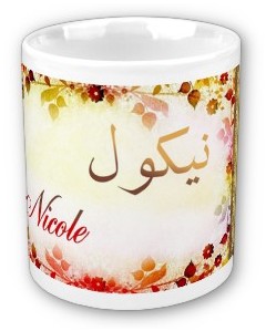 Mug avec le prénom "Nicole" calligraphié en arabe (نيكول) ainsi que son épellation lettre par lettre en arabe.