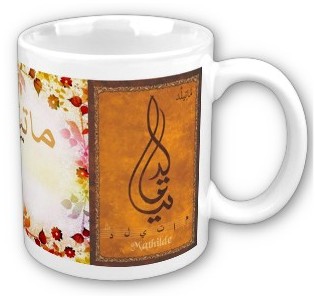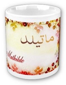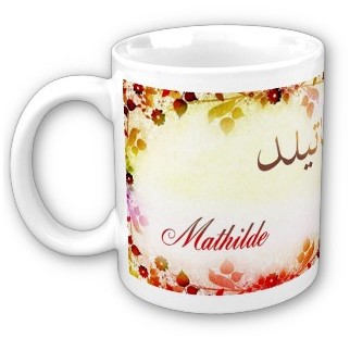 Mug avec le prénom "Mathilde" calligraphié en arabe (ماتيلد) ainsi que son épellation lettre par lettre en arabe.