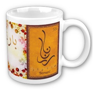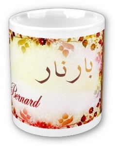 Mug avec le prénom "Bernard" calligraphié en arabe (بارنار) ainsi que son épellation lettre par lettre en arabe.