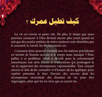 Il existe de nombreux actes pieux qui l’aident à prolonger son existence, en tenant compte de la divergence des savants quant à la signification de cette prolongation. Certains affirment qu’elle s’illustre dans la bénédiction au moment où d’autres pensent qu’elle est concrète...