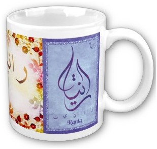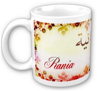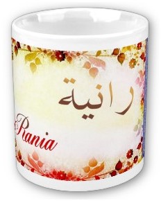 Mug avec le prénom "Rania" calligraphié en arabe (رانية) ainsi que son épellation lettre par lettre en arabe.