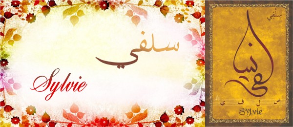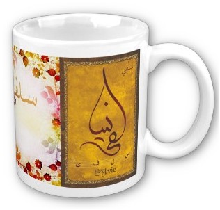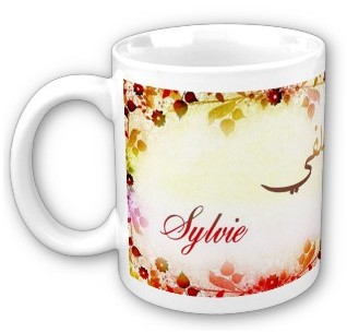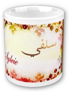 Mug avec le prénom "Sylvie" calligraphié en arabe (سلفي) ainsi que son épellation lettre par lettre en arabe.