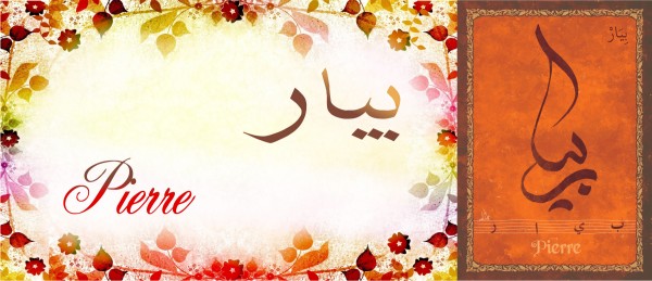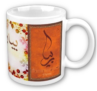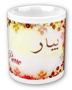 Mug avec le prénom "Pierre" calligraphié en arabe (بيار) ainsi que son épellation lettre par lettre en arabe.