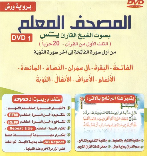 DVD interactif pour apprentissage du Coran avec lecture en version Warch du cheikh Yassin suivi des enfants et affichage du Coran à l'écran. Récitation du début de Sourate Al-Fâtiha à la fin de sourate At-Tawbah. Fonctionne sur TV avec lecteur DVD et ordinateur.