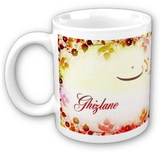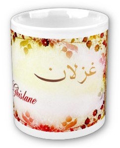 Mug avec le prénom "Ghizlane" calligraphié en arabe (غزلان) ainsi que son épellation lettre par lettre en arabe.