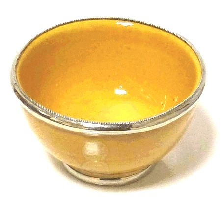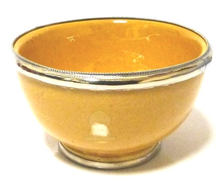 Joli récipient jaune, de taille petite, en poterie, de provenance de Marrakech (Maroc), émaillé et cerclé de métal ornemental argenté légèrement ciselé.