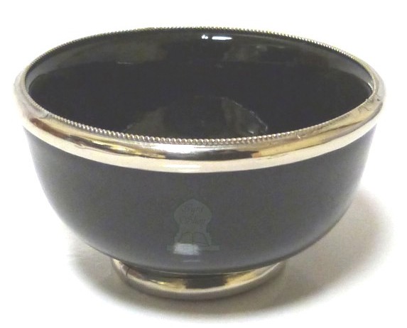 Joli récipient noir, de taille petite, en poterie, de provenance de Marrakech (Maroc), émaillé et cerclé de métal ornemental argenté légèrement ciselé.