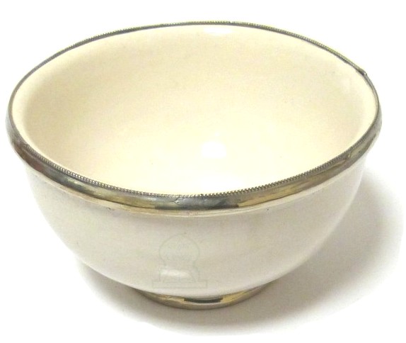 Grand bol en poterie marocain de couleur blanche émaillé et cerclé de métal argenté - REF. 15271 (7.50 €)