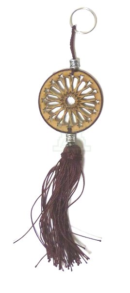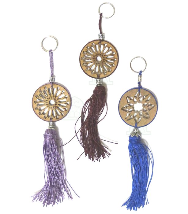 Pendentifs ou porte clé en bois avec arabesques et pompon en sabra. Plusieurs colories...
