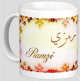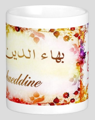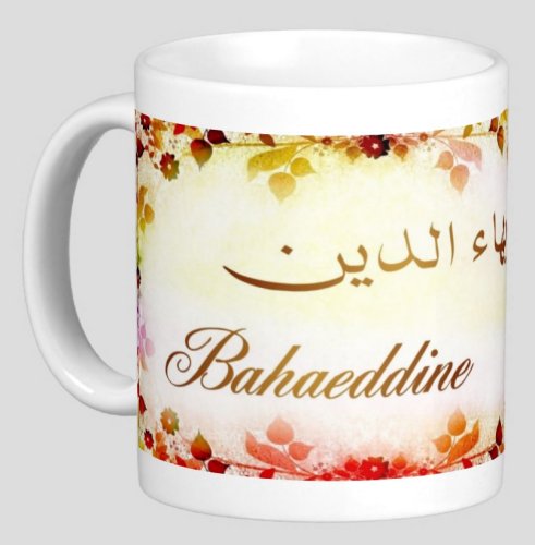 Mug avec le prénom "Bahaeddine" écrit en français, en arabe (بهاء الدين) et calligraphié de façon artistique en arabe sur la partie droite.