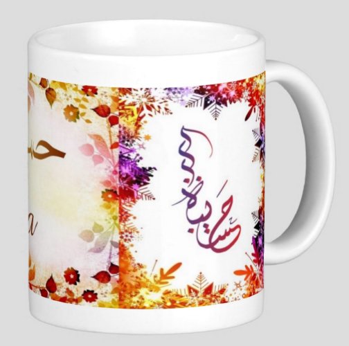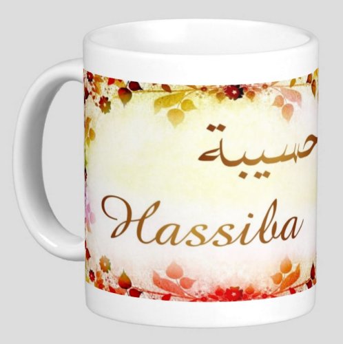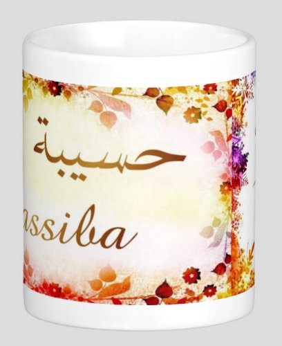 Mug avec le prénom "Hassiba" écrit en français, en arabe (حسيبة) et calligraphié de façon artistique en arabe sur la partie droite.