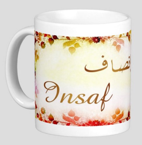 Mug avec le prénom "Insaf" écrit en français, en arabe (إنصاف) et calligraphié de façon artistique en arabe sur la partie droite.