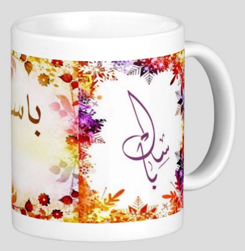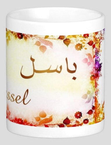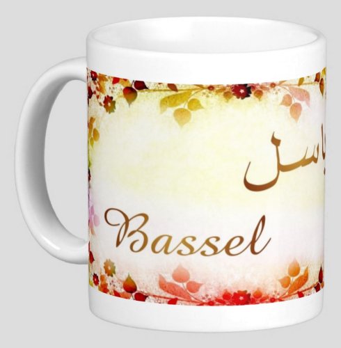 Mug avec le prénom "Bassel" écrit en français, en arabe (باسل) et calligraphié de façon artistique en arabe sur la partie droite.