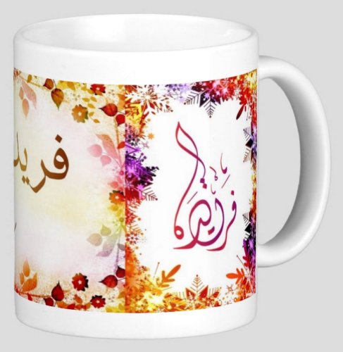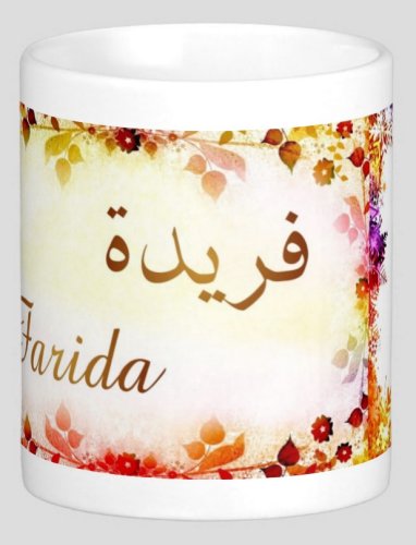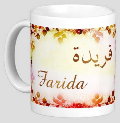 Mug avec le prénom "Farida" écrit en français, en arabe (فريدة) et calligraphié de façon artistique en arabe sur la partie droite.