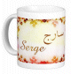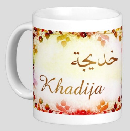Mug avec le prénom "Khadija" écrit en français, en arabe (خديجة) et calligraphié de façon artistique en arabe sur la partie droite.