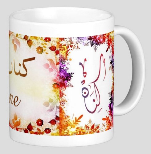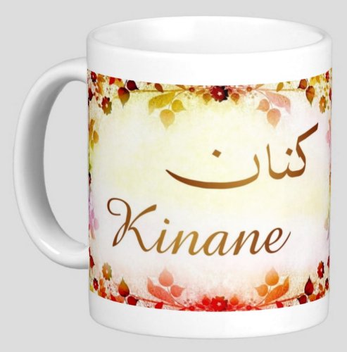 Mug avec le prénom "Kinane" écrit en français, en arabe (كنان) et calligraphié de façon artistique en arabe sur la partie droite.