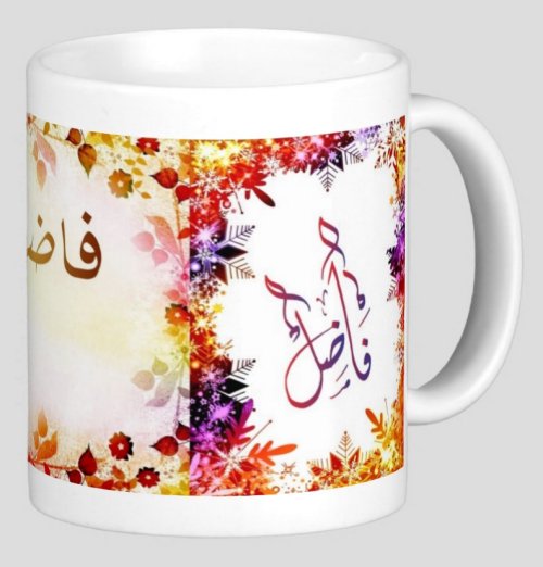 Mug avec le prénom "Fadil" écrit en français, en arabe (فاضل) et calligraphié de façon artistique en arabe sur la partie droite.