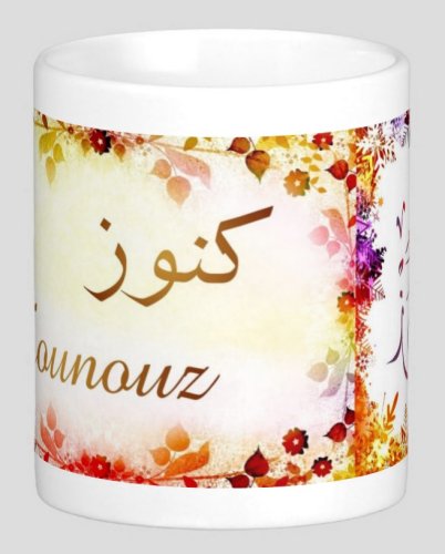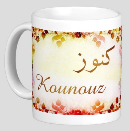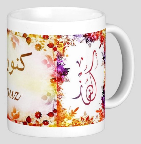 Mug avec le prénom "Kounouz" écrit en français, en arabe (كنوز) et calligraphié de façon artistique en arabe sur la partie droite.