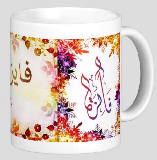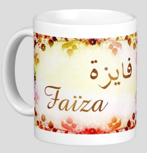Mug avec le prénom "Faïza" écrit en français, en arabe (فايزة) et calligraphié de façon artistique en arabe sur la partie droite.