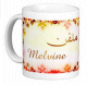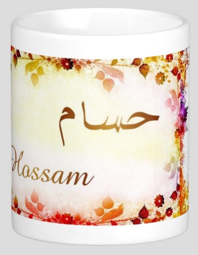 Mug avec le prénom "Hossam" écrit en français, en arabe (حسام) et calligraphié de façon artistique en arabe sur la partie droite.