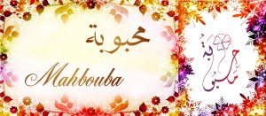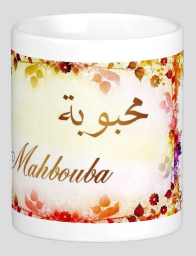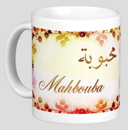 Mug avec le prénom "Mahbouba" écrit en français, en arabe (محبوبة) et calligraphié de façon artistique en arabe sur la partie droite.