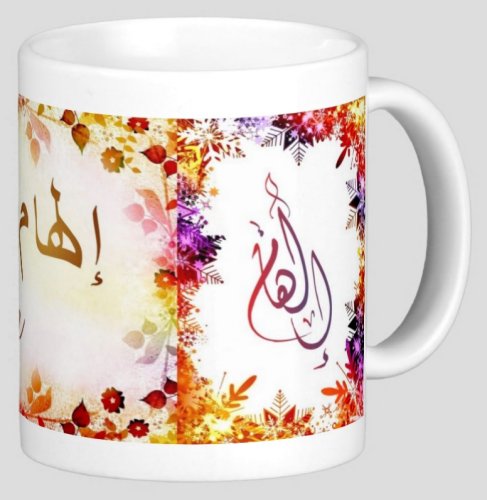 Mug avec le prénom "Ilham" écrit en français, en arabe (إلهام) et calligraphié de façon artistique en arabe sur la partie droite.