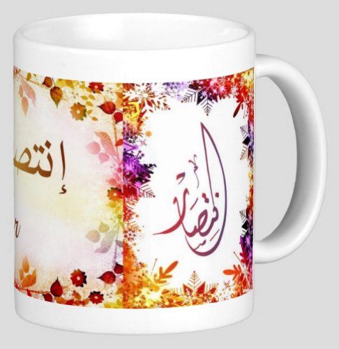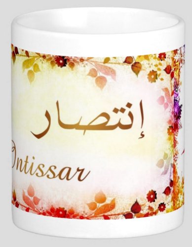 Mug avec le prénom "Intissar" écrit en français, en arabe (إنتصار) et calligraphié de façon artistique en arabe sur la partie droite.