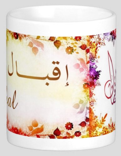 Mug avec le prénom "Iqbal" écrit en français, en arabe (إقبال) et calligraphié de façon artistique en arabe sur la partie droite.