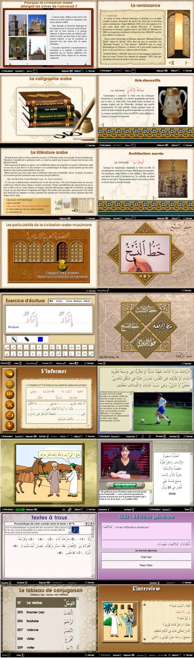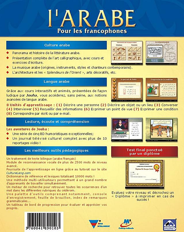 Sans oublier l’ensemble des fonctionnalités de la méthode L’arabe pour les francophones : Moteur de recherche - Console d’enregistrement - Tableau de bord de progression - Remarques linguistiques imprimables - Méthode Multi-Utilisateurs – Poursuite de l’apprentissage sur Internet - Aide en ligne et aide contextuelle...