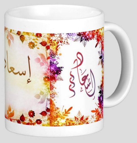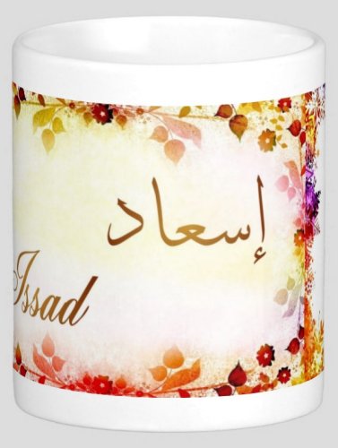 Mug avec le prénom "Issad" écrit en français, en arabe (إسعاد) et calligraphié de façon artistique en arabe sur la partie droite.