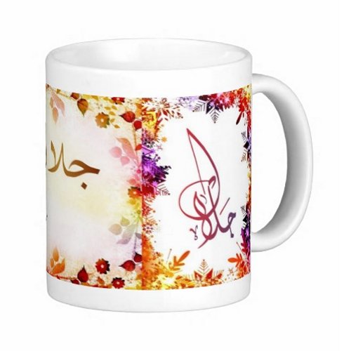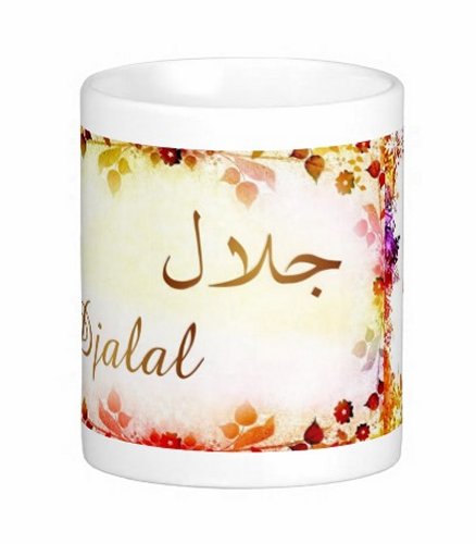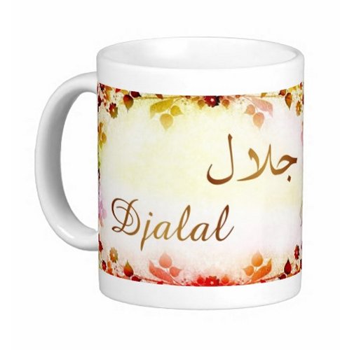 Mug avec le prénom "Djalal" écrit en français, en arabe (جلال) et calligraphié de façon artistique en arabe sur la partie droite.