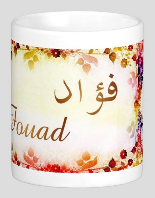 Mug avec le prénom "Fouad" écrit en français, en arabe (فؤاد) et calligraphié de façon artistique en arabe sur la partie droite.