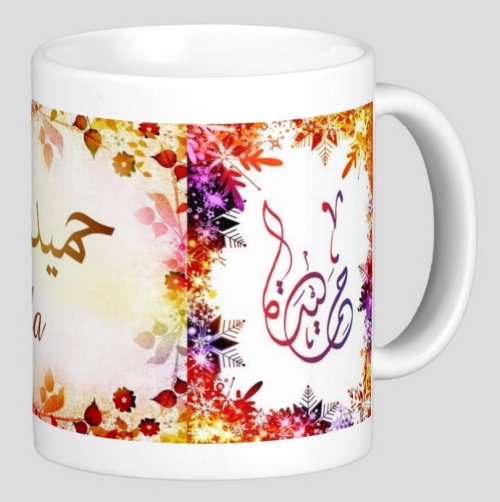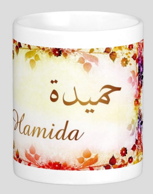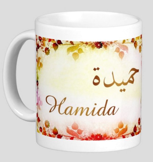 Mug avec le prénom "Hamida" écrit en français, en arabe (حميدة) et calligraphié de façon artistique en arabe sur la partie droite.